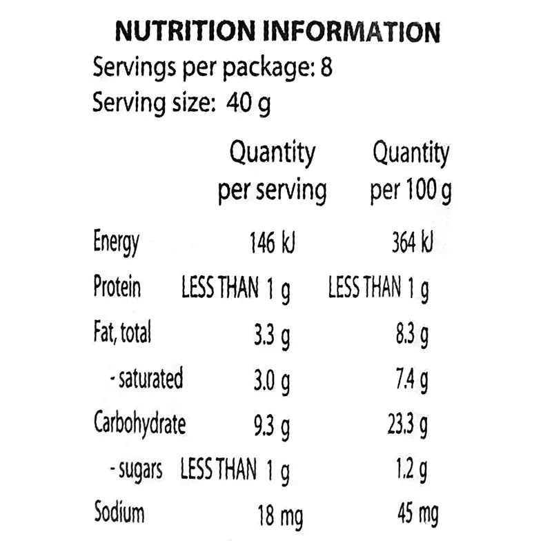 Macros: per teaspoon cos' that's how we roll :) Net carbs: 1.1g naturally occurring sugars 0.05g, Fat 0.5g, Saturated Fat 0.4g, Protein 0.08g Energy 32kj Sodium 4mg