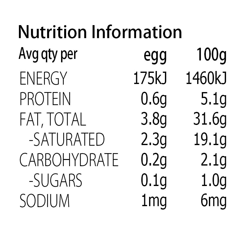 • per 12g egg, Energy 175kJ, Protein 0.6g, Fat 3.8g, saturated 2.3g, Carbohydrates 0.2g, sugars 0g, Sodium 0.5mg