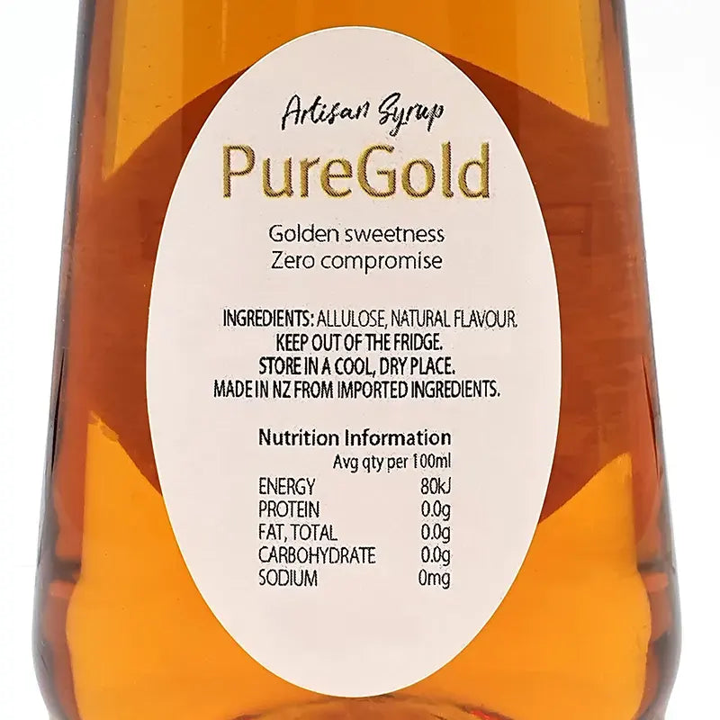 PureGold Syrup per 100ml: 80kJ (19 calories) Energy, Protein 0g, Fat 0g, Carbohydrates 0g.