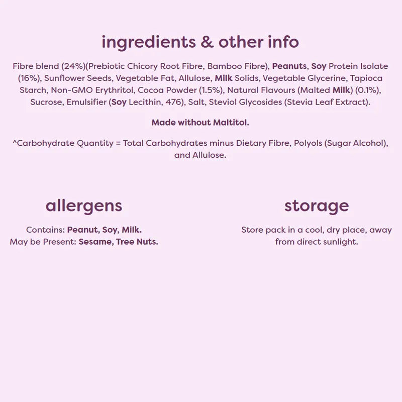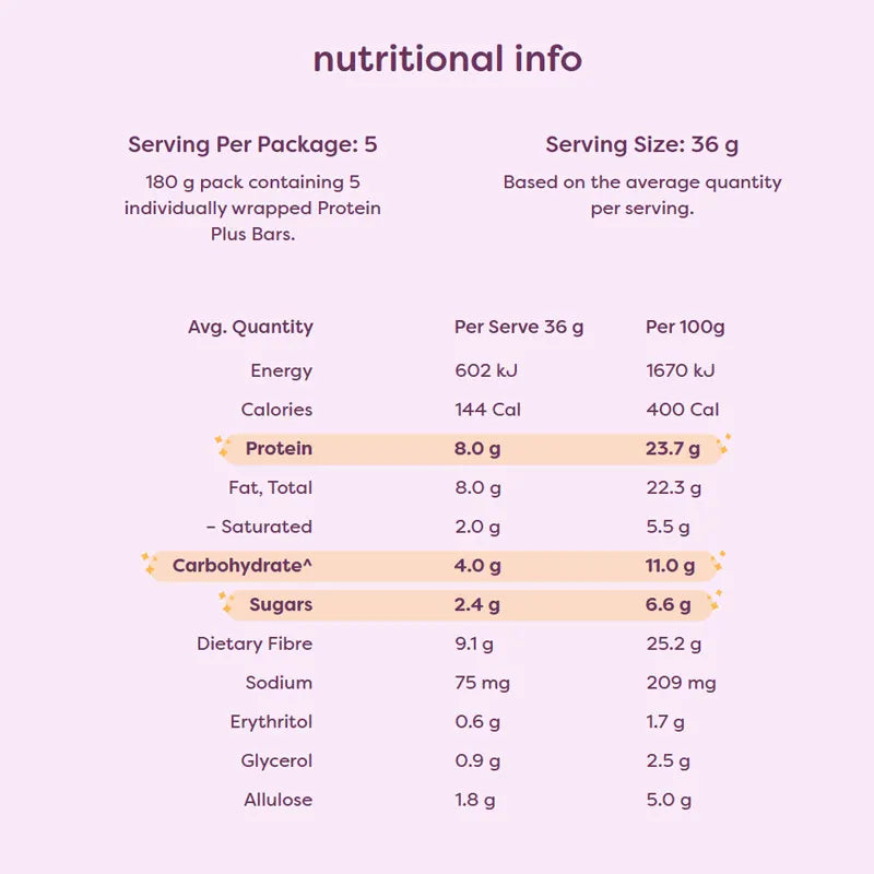 • Per bar 8g protein, 9g fibre, 4g carbs