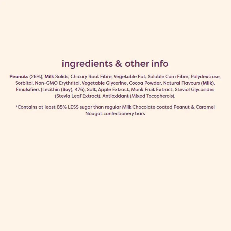 Contains at least 85% LESS sugar than regular Milk Chocolate Coated Peanut & Caramel Nougat confectionery bars