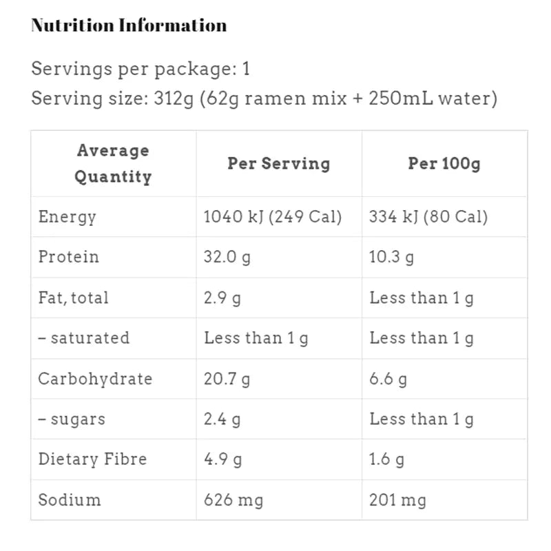 A: One prepared serve is 312 g (62 g ramen mix + 250 mL water) and ≈ 249 Calories.